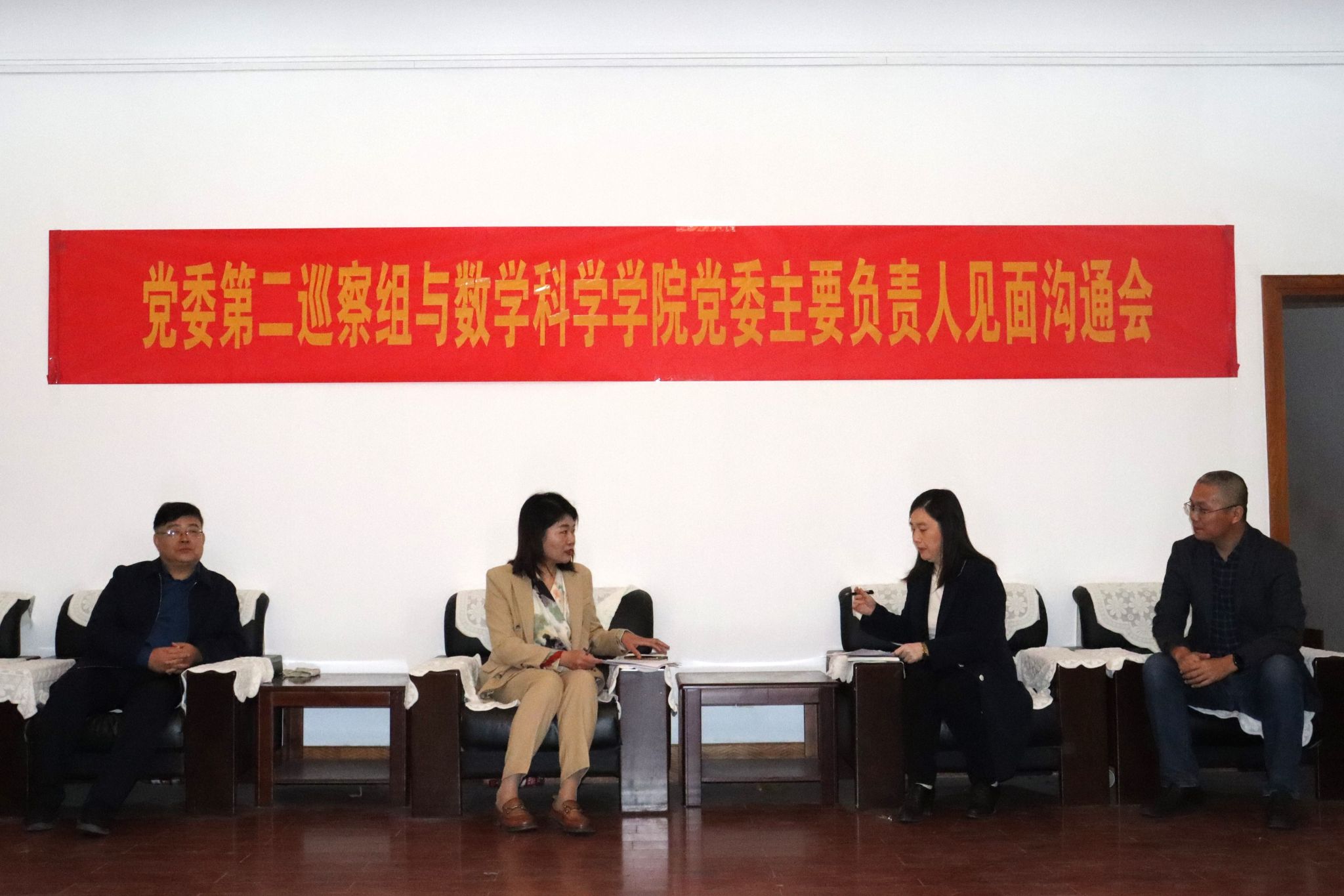 会前,党委第二巡察组组长、纪委副书记孙菲菲与数学科学学院党委主要负责人进行了沟通交流。