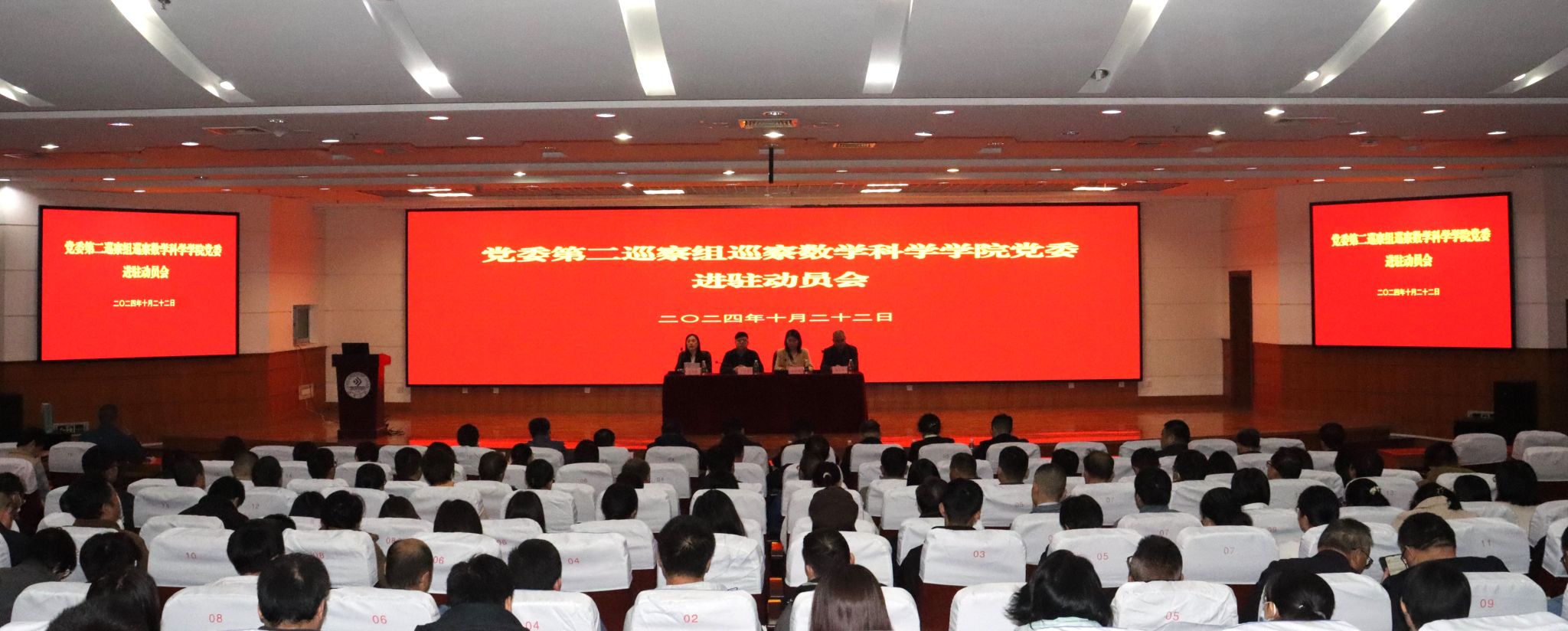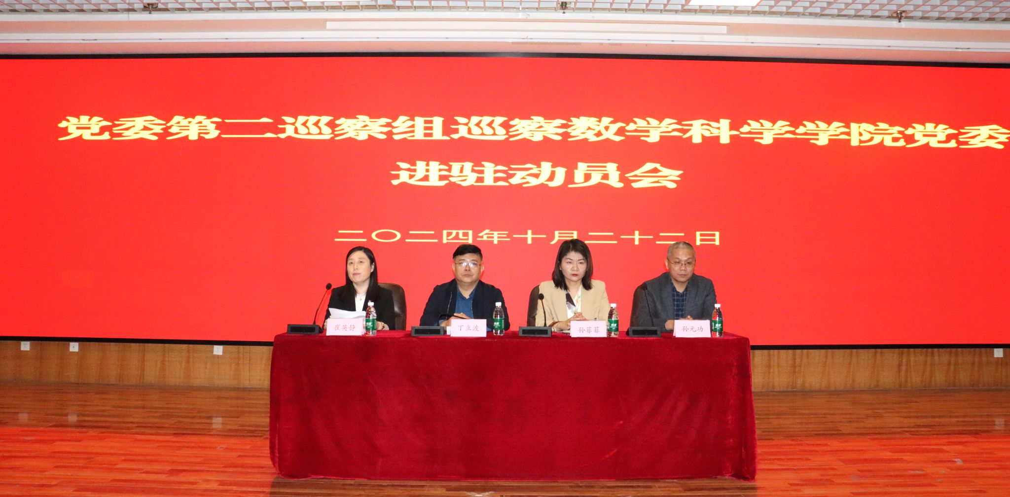 按照学校党委巡察工作统一部署,2024年10月22日下午,党委第二巡察组巡察数学科学学院党委进驻动员会在第二学术报告厅召开。学校党委巡察工作领导小组成员、巡察办主任丁立波同志,党委第二巡察组全体成员,专项巡察负责同志,数学科学学院全体教职工及部分学生代表参加会议。数学科学学院党委书记崔英静主持会议。